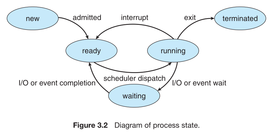 Process state: ready, running, wait, and suspended